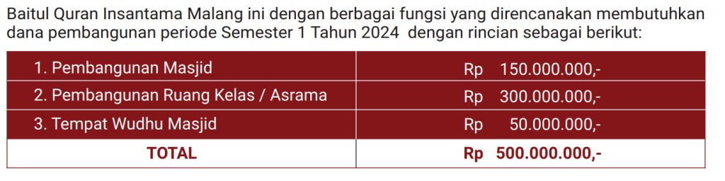 Dana sejumlah di atas, diharapkan bisa didapat dari infaq jariyah kaum muslimin sesuai dengan keikhlasan dan kemampuan masing-masing ataupun dari CSR perusahaan tertentu. Dengan ini, panitia pembangunan Baitul Quran Insantama Malang membuka kesempatan kepada Bapak / Ibu / Pimpinan Perusahaan / kaum muslimin untuk menyisihkan sebagian rezeki yang telah dianugerahkan oleh Allah swt untuk berinfaq, yang insyaallah akan menjadi infaq jariyah dan kebaikan yang berlimpah sebagaimana sabda baginda Nabi shalallahu ‘alaihi wassalam: