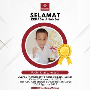 Fadhil Khairy, Kelas 3 atas prestasinya menjadi *Juara 2* Kelompok 11 kelas usia dini -25kg Karate Championship 2022, Piala Koni Kota Malang & Pengprov KKI Jatim, 20-21 Agustus 2022