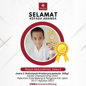Rasyid Abdurrahman, Kelas 5 atas prestasinya menjadi *Juara 2* Kelompok 8 kelas pra pemula -30kg Karate Championship 2022, Piala Koni Kota Malang & Pengprov KKI Jatim, 20-21 Agustus 2022