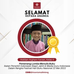 Wafdan Arghani Farzan, Kelas 4 atas prestasinya menjadi *Pemenang Lomba Menulis Buku* Ikatan Penerbit Indonesia (Ikapi) Jatim & Media Guru Indonesia, dalam Rangka Festival Hari Buku Nasional 22 Mei 2022